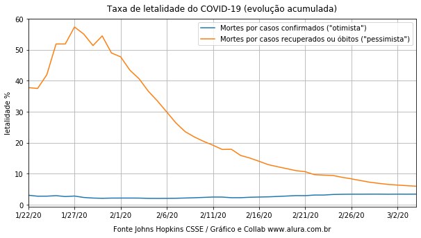 Para nosso curso de Data Science em saúde e medicina analisamos um mês e meio de dados do vírus SARS-CoV-2, causador da COVID-19, podemos ver, por exemplo, que a medida que o tempo passa, a taxa de letalidade da doença parece tender para um ponto específico: 3.4%, que é o número também citado pela Organização Mundial da Saúde no início de março.